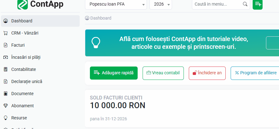 Observație: Poți schimba firma activă de oriunde din ContApp prin apăsarea selectorului de Firmă activă din meniul superior.