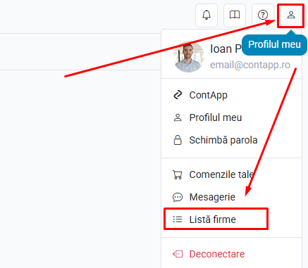 Pentru a ajunge în lista firmelor, apasă butonul profil și selectează Listă firme.