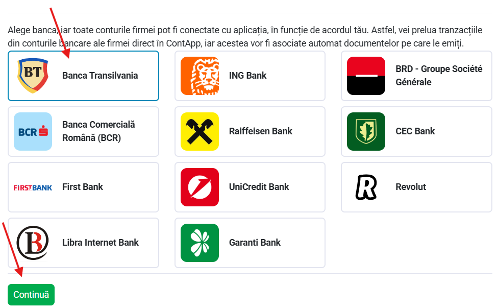 2.Apăsați pe butonul de Conectare cu Banca, selectați banca și apăsați pe butonul "Continuă".