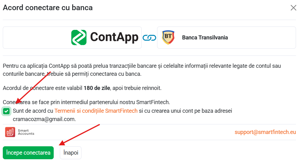 8.Ultimul pas din autorizare este confirmarea, încă o dată, a descărcării tranzacțiilor pentru conturile selectate în aplicația ContApp.