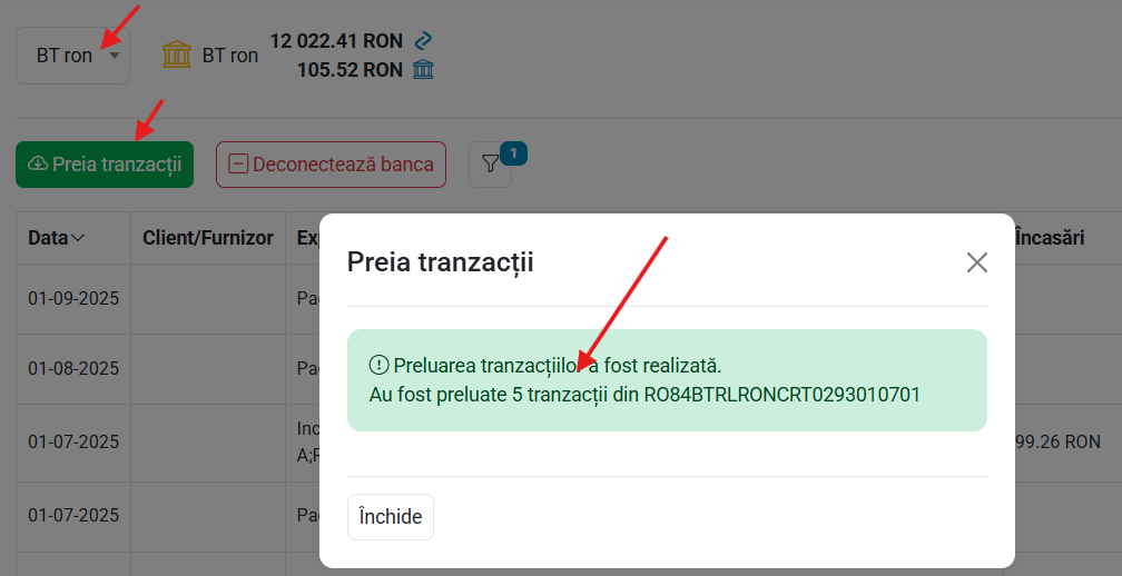 După descărcarea tranzacțiilor bancare, acestea se preiau în contabilitate, dacă nu au fost introduse manual.