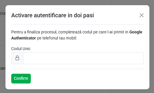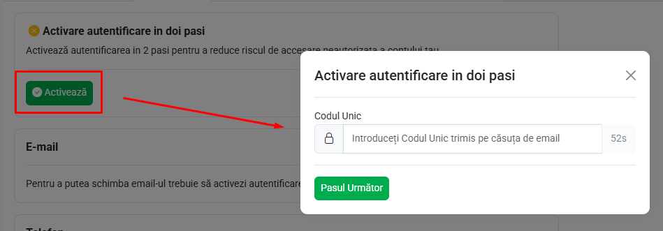 - Introdu codul unic trimis pe emailul asociat contului.
