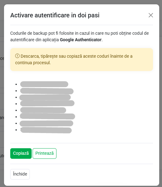 - Salvează codurile de backup și apoi poți închide formularul.