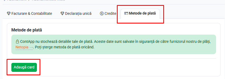 Important! Datele cardului le vei introduce doar în platforma NETOPIA Payments, procesator de plăți autorizat de BNR. ContApp nu stochează datele cardului tău.