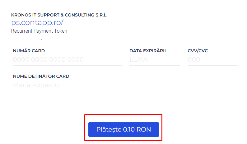 Introdu datele cardului bancar și continuă prin a apăsa butonul Plătește 0.10 RON.