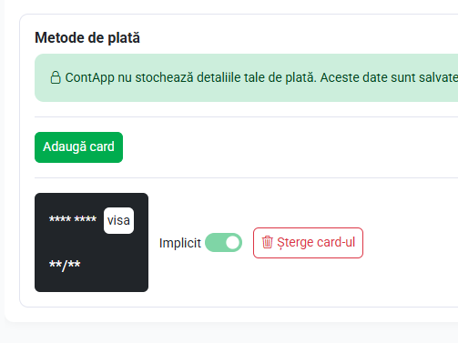 Se pot adăuga mai multe carduri. Plata se va face de pe cardul cu opțiunea Implicit bifată.