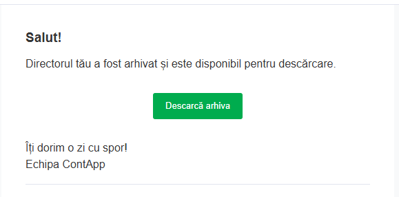 Adițional, se trimite și un email cu link pentru a descărca arhiva. Linkul rămâne valabil timp de 30 de zile.
