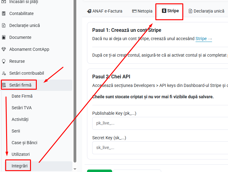 Accesează Setări firmă / Integrări / Stripe