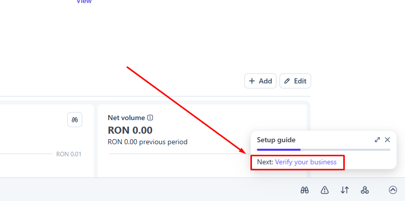 Pentru a adăuga datele firmei tale, apasă butonul Verify your business din colțul din dreapta jos a paginii.