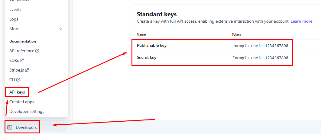 Accesează secțiunea Developers > API keys din Dashboard-ul Stripe și copiază cheile de mai jos in secțiunea Stripe din ContApp.