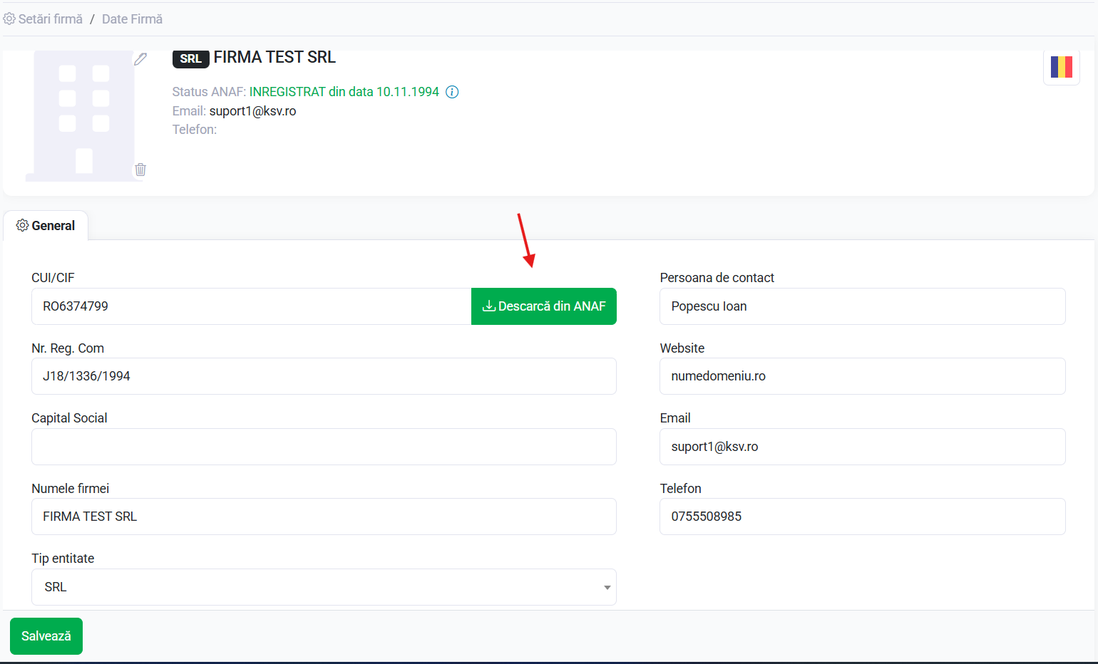 - Date Firmă - datele generale ale entității - se descarcă automat din ANAF;
