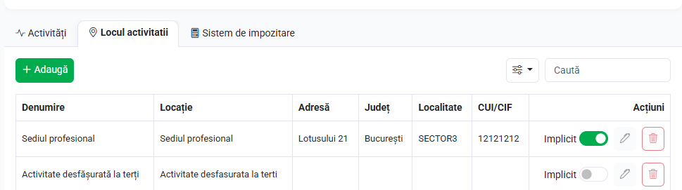 În secțiunea dedicată din ContApp, este preluat automat ca loc al activități, adresa sediului profesional, care este unic. Adresa de la sediul profesional este preluată automat din datele generale ale entității, așa cum a fost declarat la Registrul Comerțului sau la ANAF.