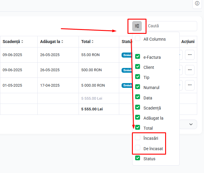 Coloanele "încasări" și "de încasat" nu sunt afișate implicit în listă. Dacă le dorești afișate, acestea trebuie bifate.