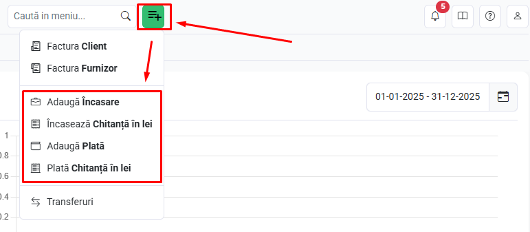 Folosește butonul din meniul superior pentru a adăuga rapid încasări sau plăți de oriunde din ContApp.