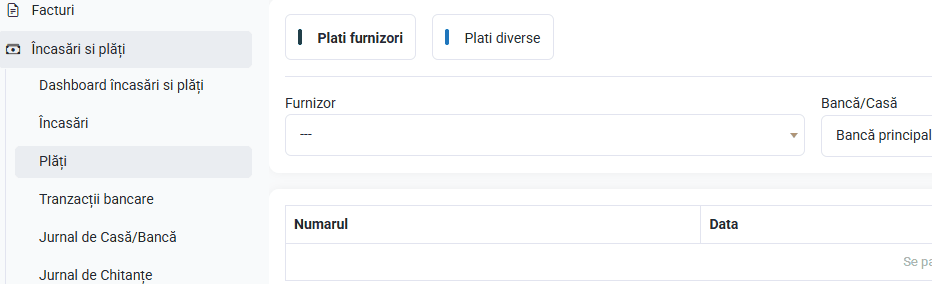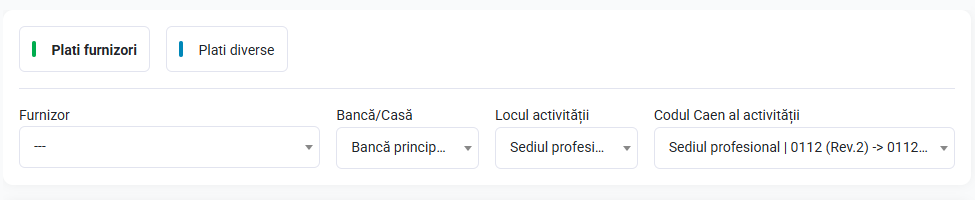 În mod implicit este selectat Plăți furnizori la adăugarea unei plăți noi. Se poate schimba cu plăți diverse prin apăsarea butonului Plăți diverse.