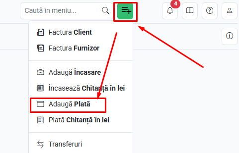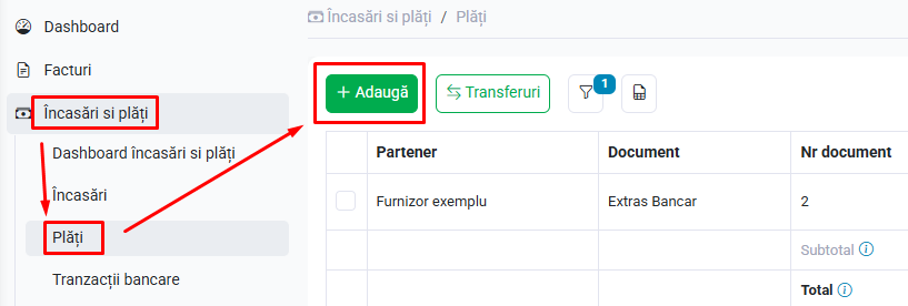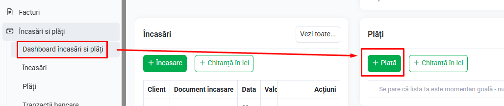 Din dashboard Încasări și plăți, navighează mai jos la tabelul cu Plăți și apasă butonul Plată;