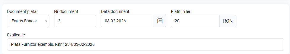Observație! Dacă plata se realizează în altă valută, ContApp face automat conversia în lei și completează explicația cu suma în valută plătită și cursul de schimb valabil pentru data plății.
