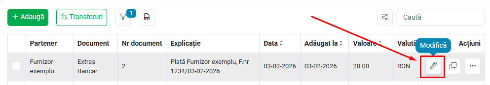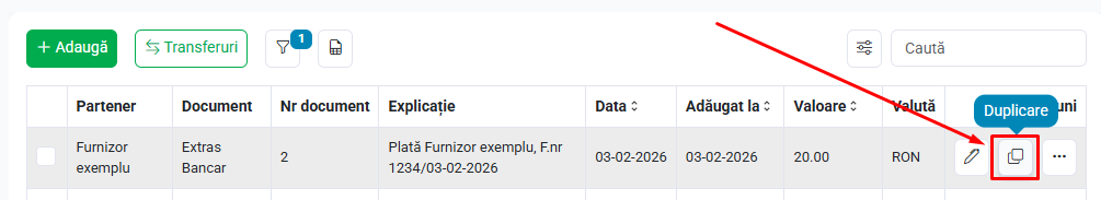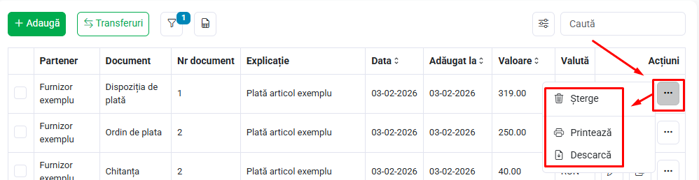 În lista de plăți, poți gestiona plățile existente folosind butoanele din meniul de acțiuni.