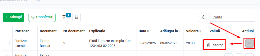 Pentru a șterge o plată, apasă butonul de acțiuni și alege opțiunea Șterge.