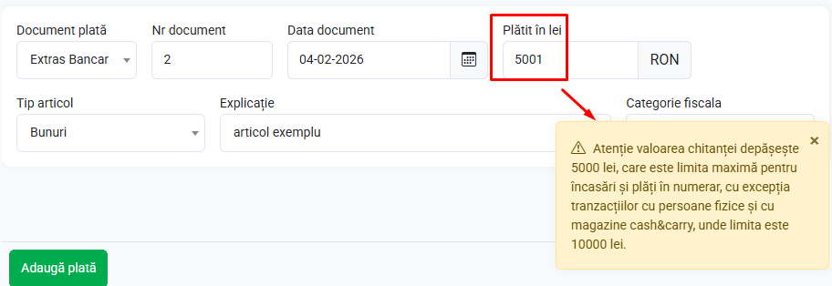 Important! ContApp te va notifica că nu poți plăti mai mult de 5000 în numerar către un furnizor. Maxim 10.000 către magazinele Cash&Carry.