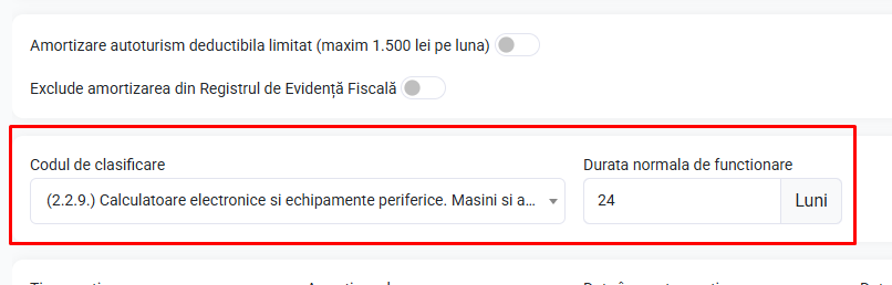 De exemplu, pentru calculatoare se poate alege clasa "2.2.9 Calculatoare electronice și echipamente periferice. Mașini și aparate de casă, control și facturat." cu perioadă normală de funcționare de 24 de luni.