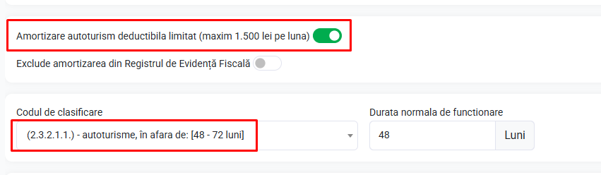 Pentru autoturismele utilizate de către titularul activității, amortizarea este deductibilă în limita a 1.500 lei/lună. Pentru limitarea deducerii la 1.500 lei pe lună în Registrul de evidență fiscală se bifează Amortizare autoturism deductibilă limitat (maxim 1.500 lei pe lună).