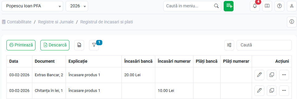 Accesează: Registre și Jurnale / Registrul de încasări și plăți