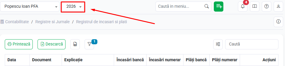 Anul - poți selecta anul pentru care se afișează registrul de încasări și plăți.