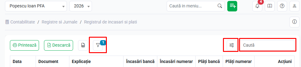 Filtrare lista registrului de încasări și plăți