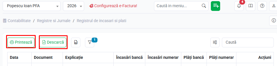 Printează / Descarcă - Printează sau descarcă (format pdf) lista registrului de încasări și plăți pentru anul selectat.