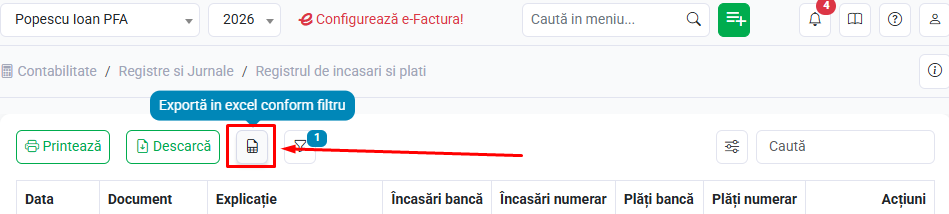 Exportă - Descarcă (format xlsx) lista registrului de încasări și plăți pentru anul selectat.