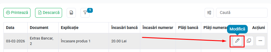 Modifică - Pentru editare încasare/plată, apasă butonul Modifică, editează ceea ce este necesar și apasă butonul Actualizează pentru a salva modificările.