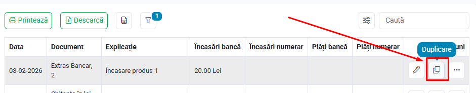 Duplicare - Poți duplica încasări/plăți folosind butonul de duplicare.