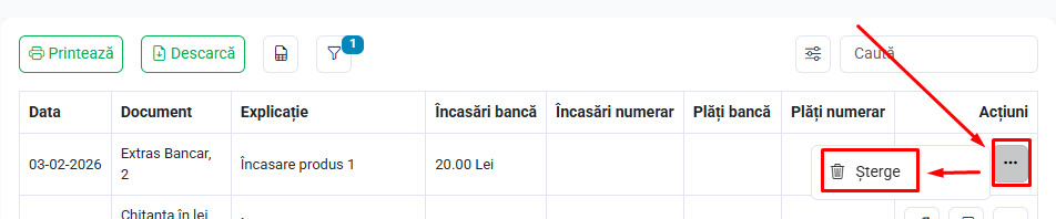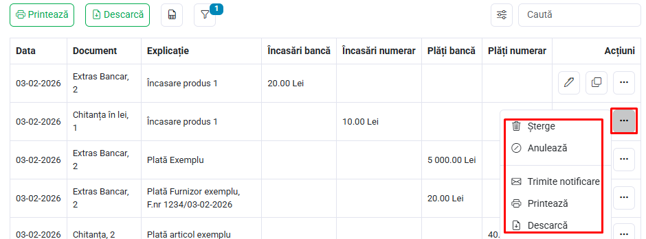 În lista registrului de încasări și plăți, poți gestiona încasările și plățile existente folosind butoanele din meniul de acțiuni.