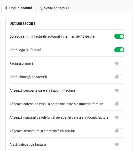 În această pagină se află următoarele preferințe pentru facturile firmei;